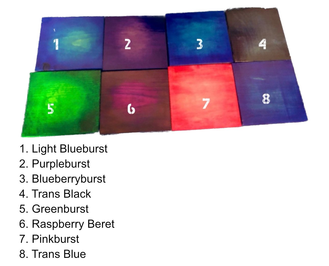 Available finishes: DropDeadRed (metallic), Arctic White, Gloss or Matte Black, Foam Green, Metallic Blue, and more to come! Got a paint color number we can match? Transparents including 4 and 5A flame maple drop-top options available in a variety of hand-rubbed dye finishes - Light Blue, Phthalo Blue, Green, Kelly Green, BlueBurst and Greenburst! Specify color choice in order notes, please.